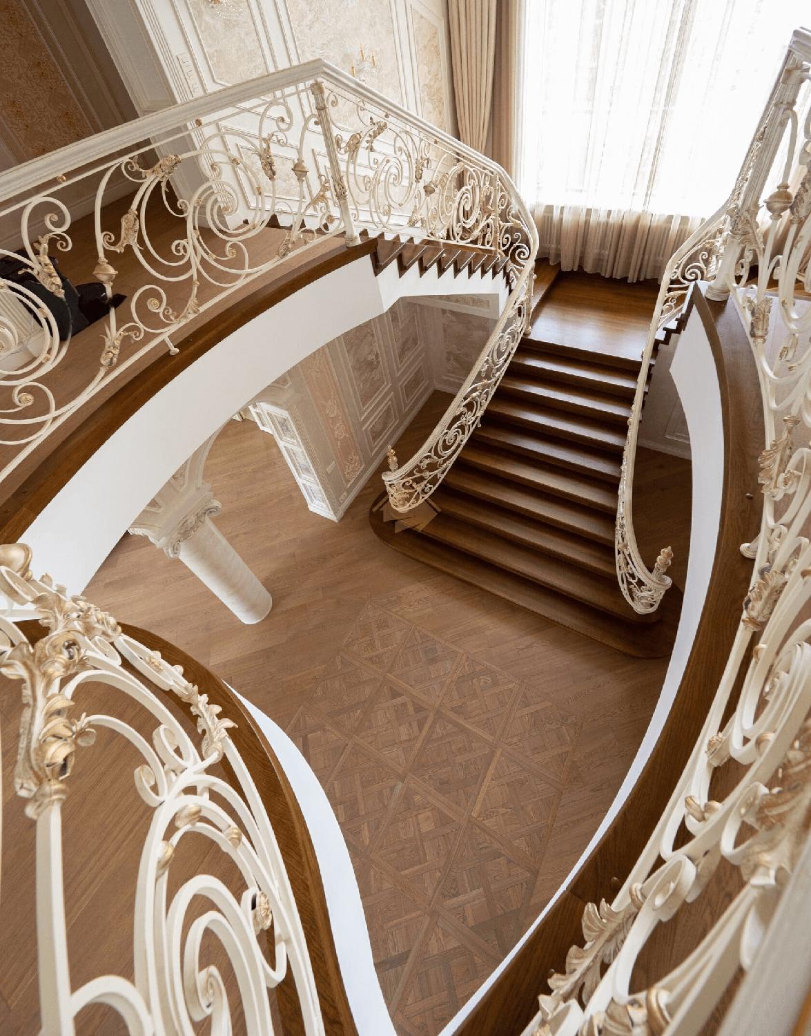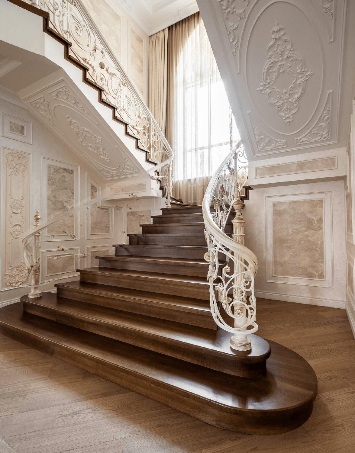 Эксклюзивная парадная лестница с тремя маршами и широкими пригласительными ступенями.