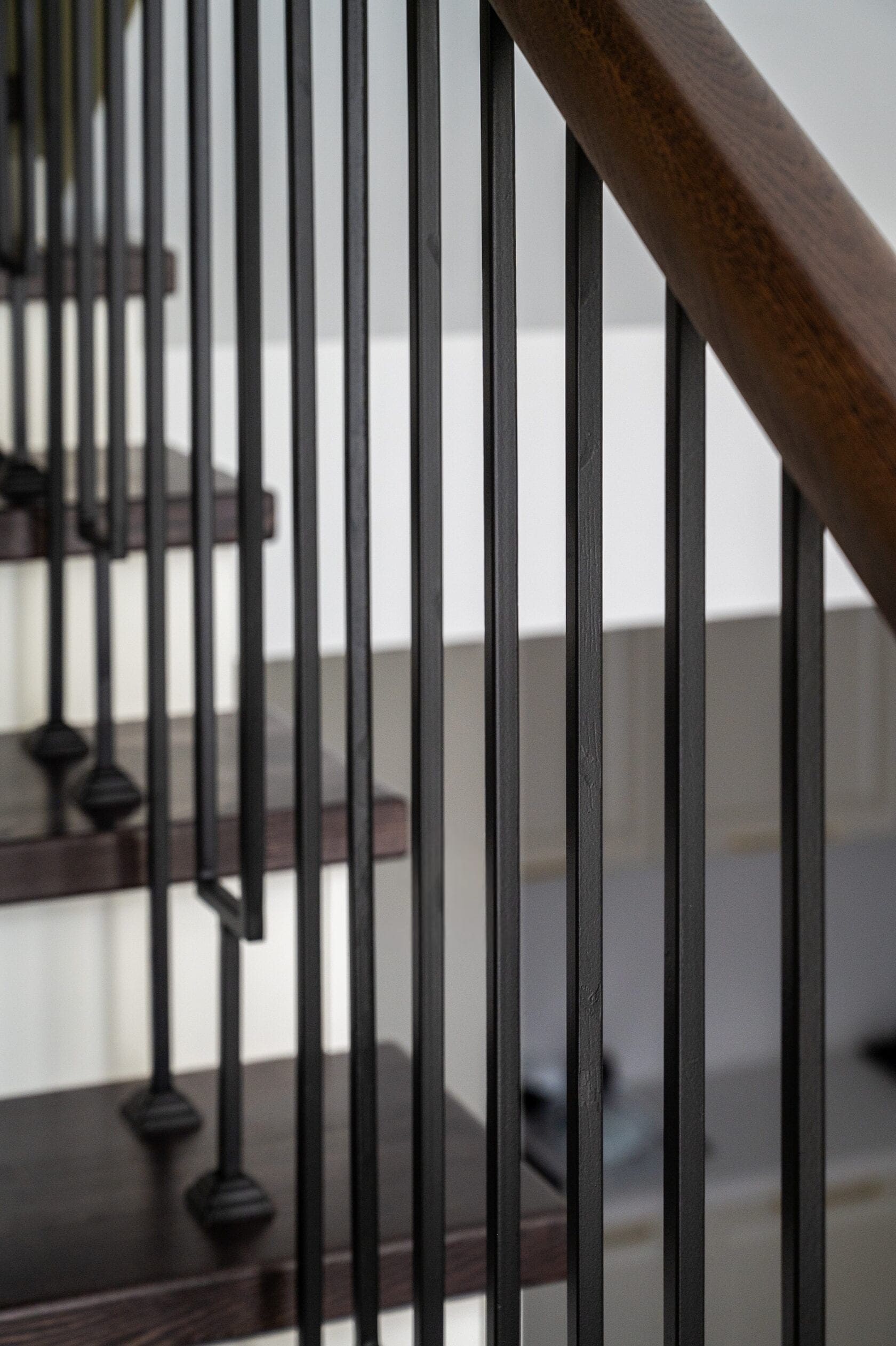 Тонкие элементы ограждения, отсутствие шляпок на столбах, резных элементов, прямоугольные поручни.