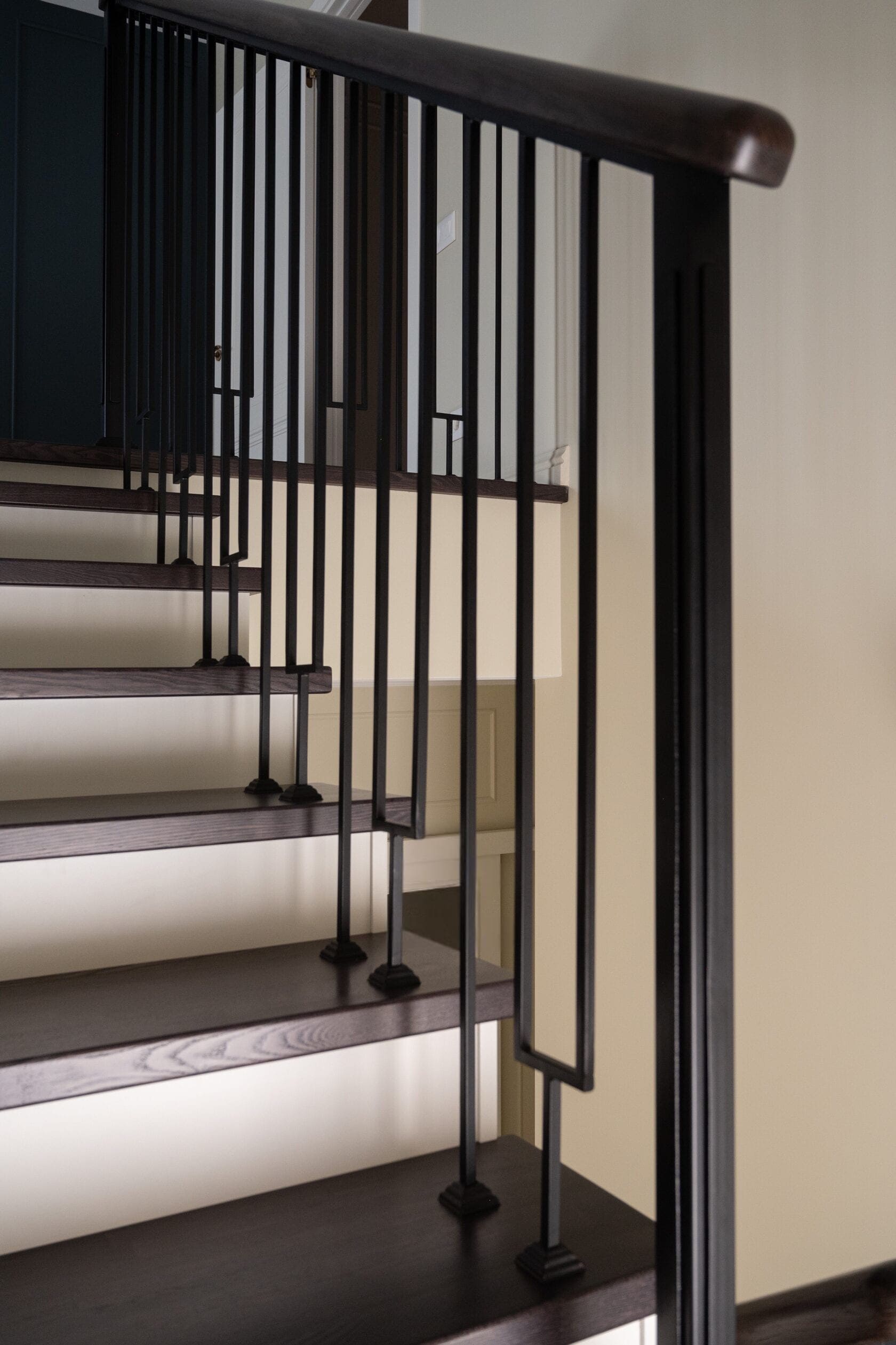 Балясины без накладок. Лестницы без подступенков, стекло, подсветка, рейки, без плинтуса у стены. Все это современный минимализм.