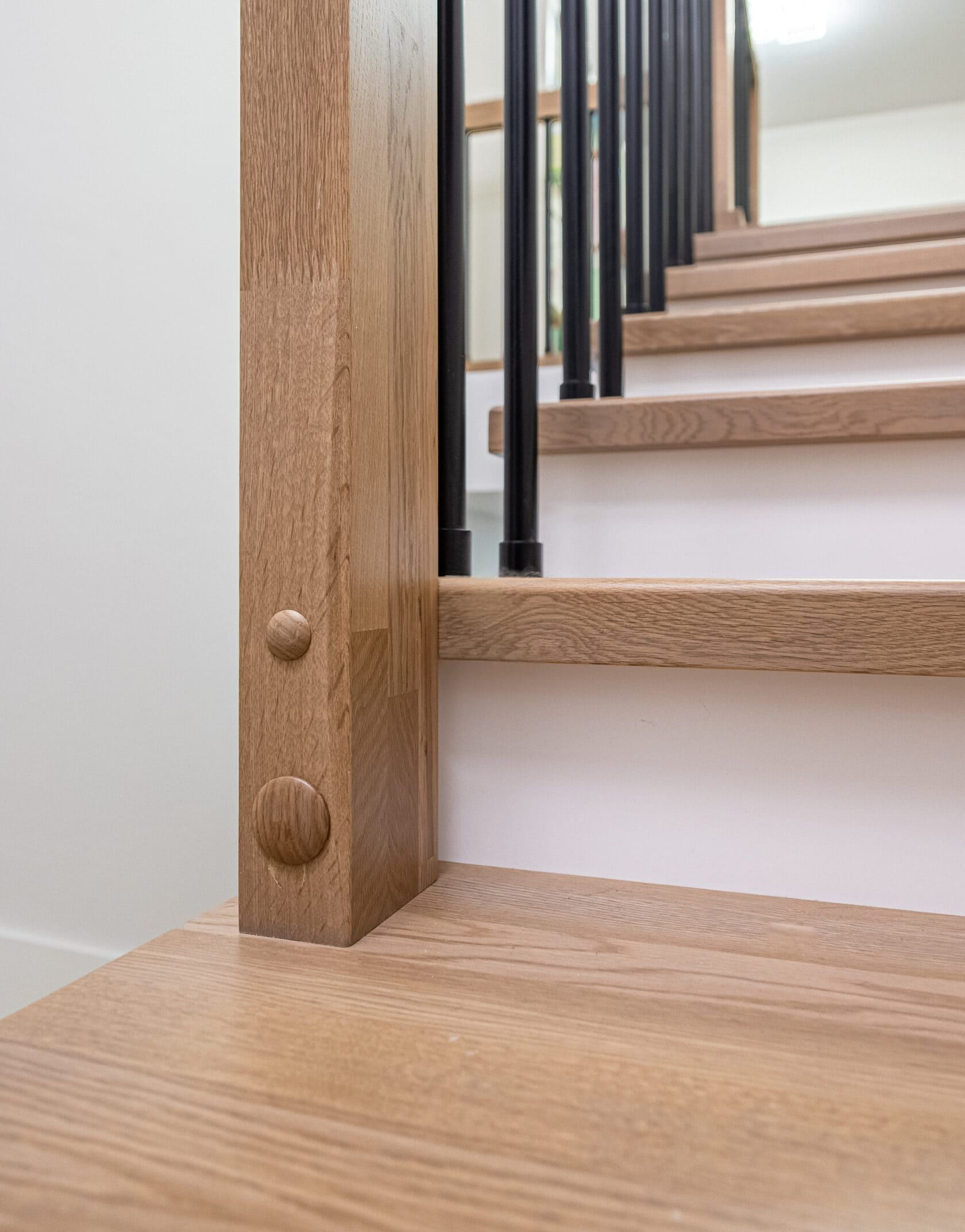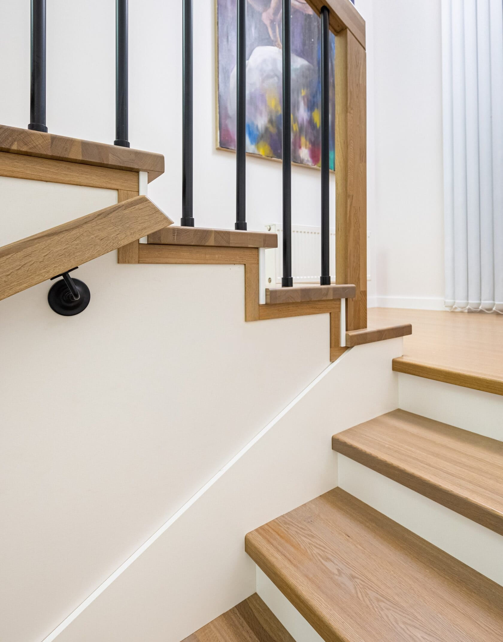 Облицовка бетонной лестницы цельноламельным дубом, подступенки и плинтус из МДФ под белой эмалью.