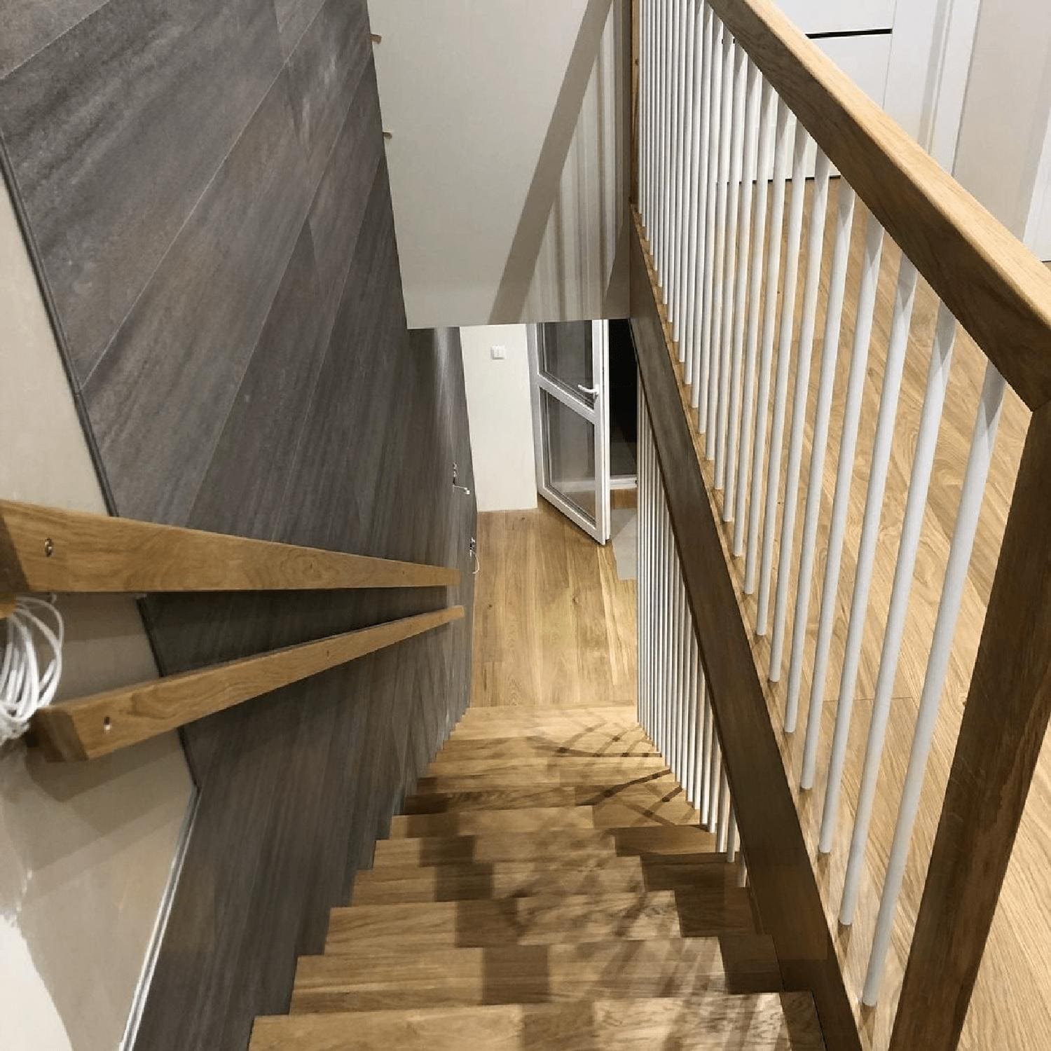 Самый воздушный тип открытых лестниц. Опорная конструкция монтируется внутрь стены. Ступени-короба полностью закрывают черновой металл