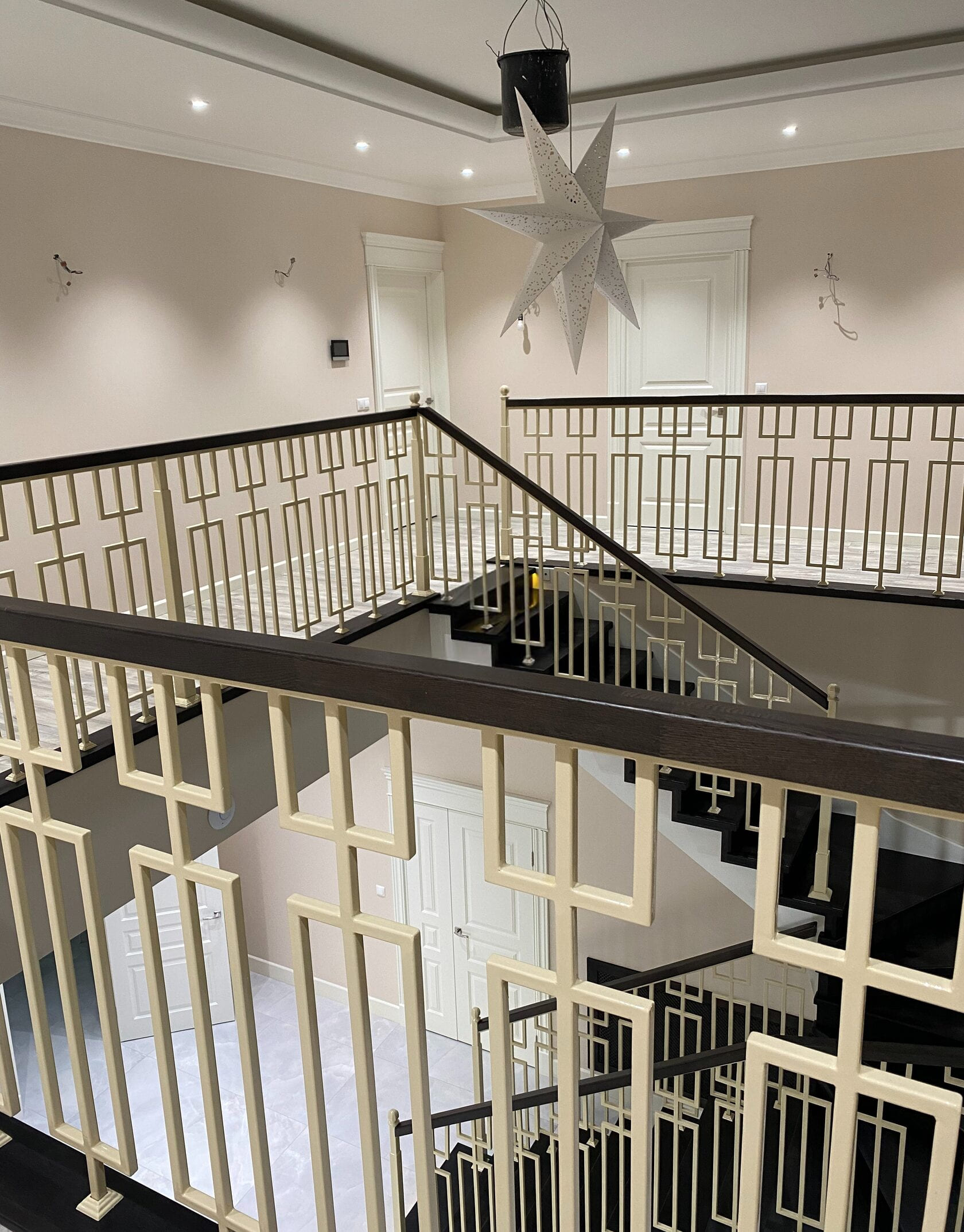 Обшили бетон вместе с опорным столбом. Ступени и подступенки из сращенного дуба. На темном цвете склеек сращенного дерева почти не видно. Под ступенями подсветка теплого света. Сварное ограждение на лестнице и балюстраде
