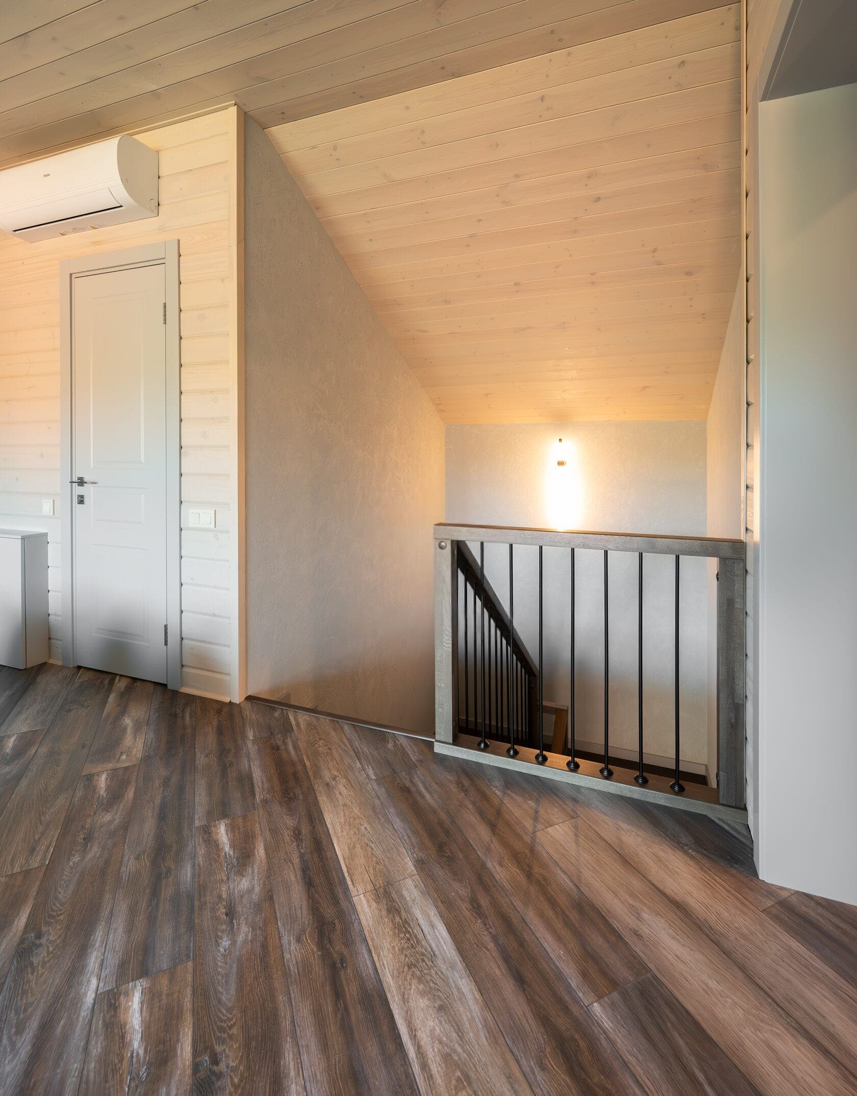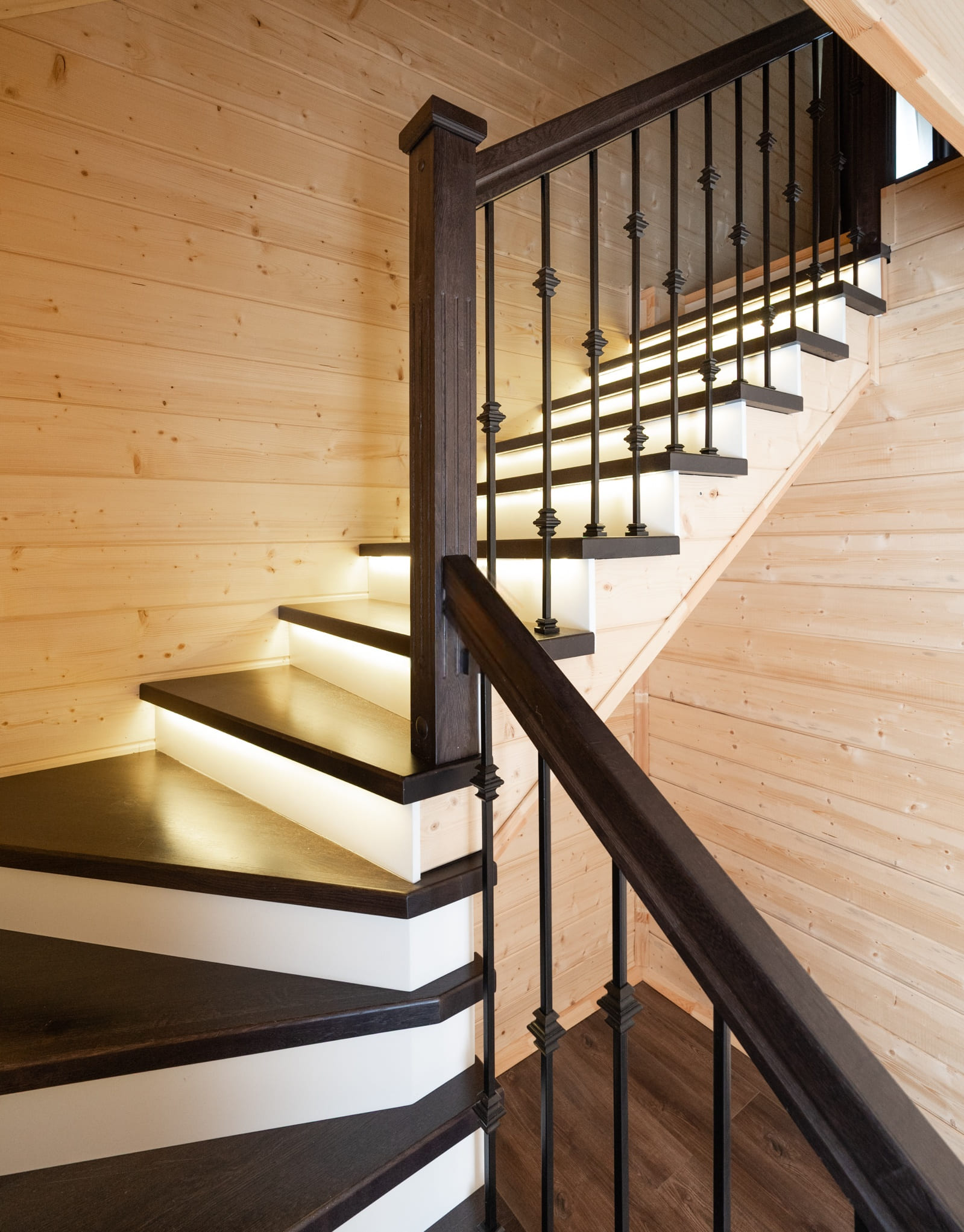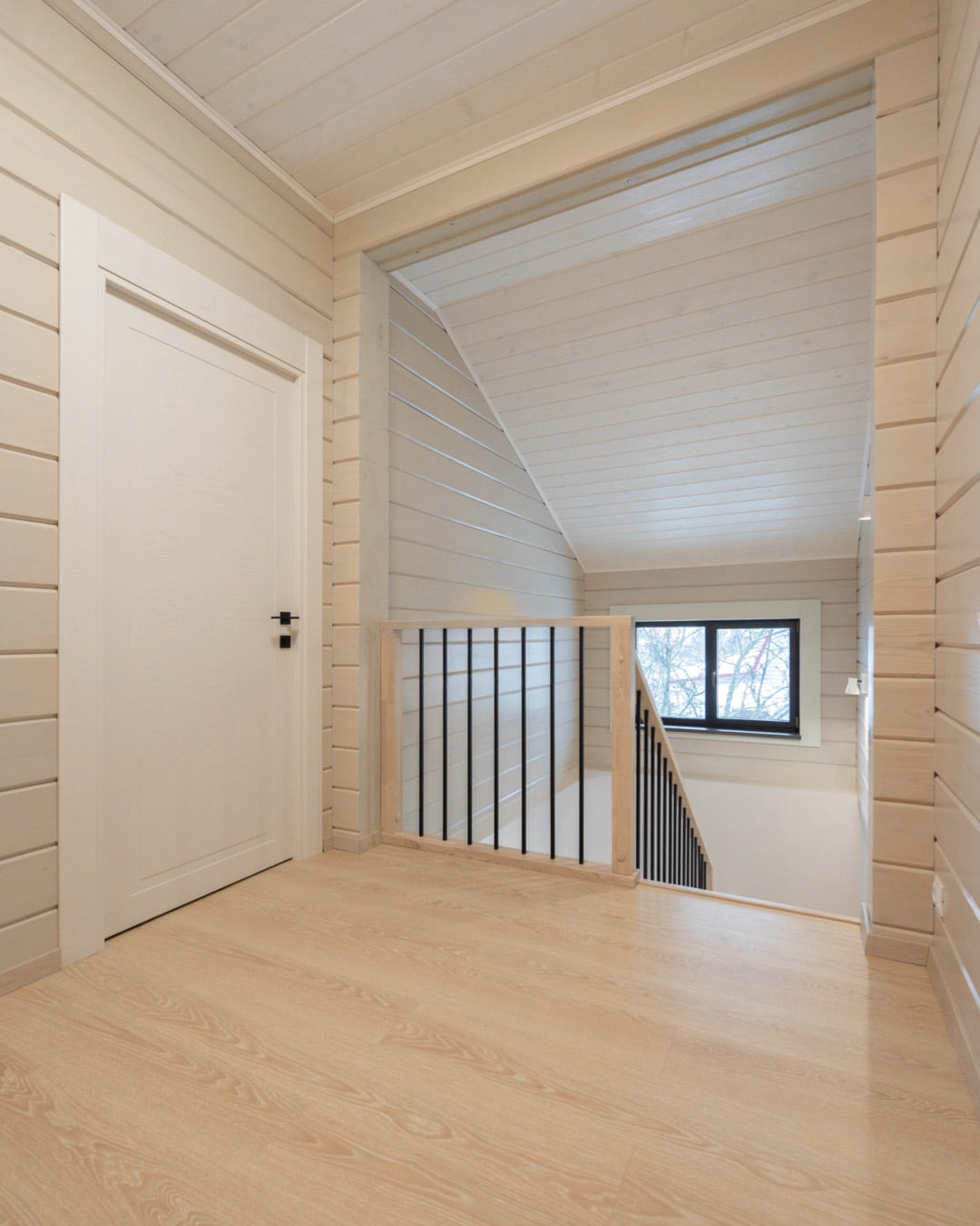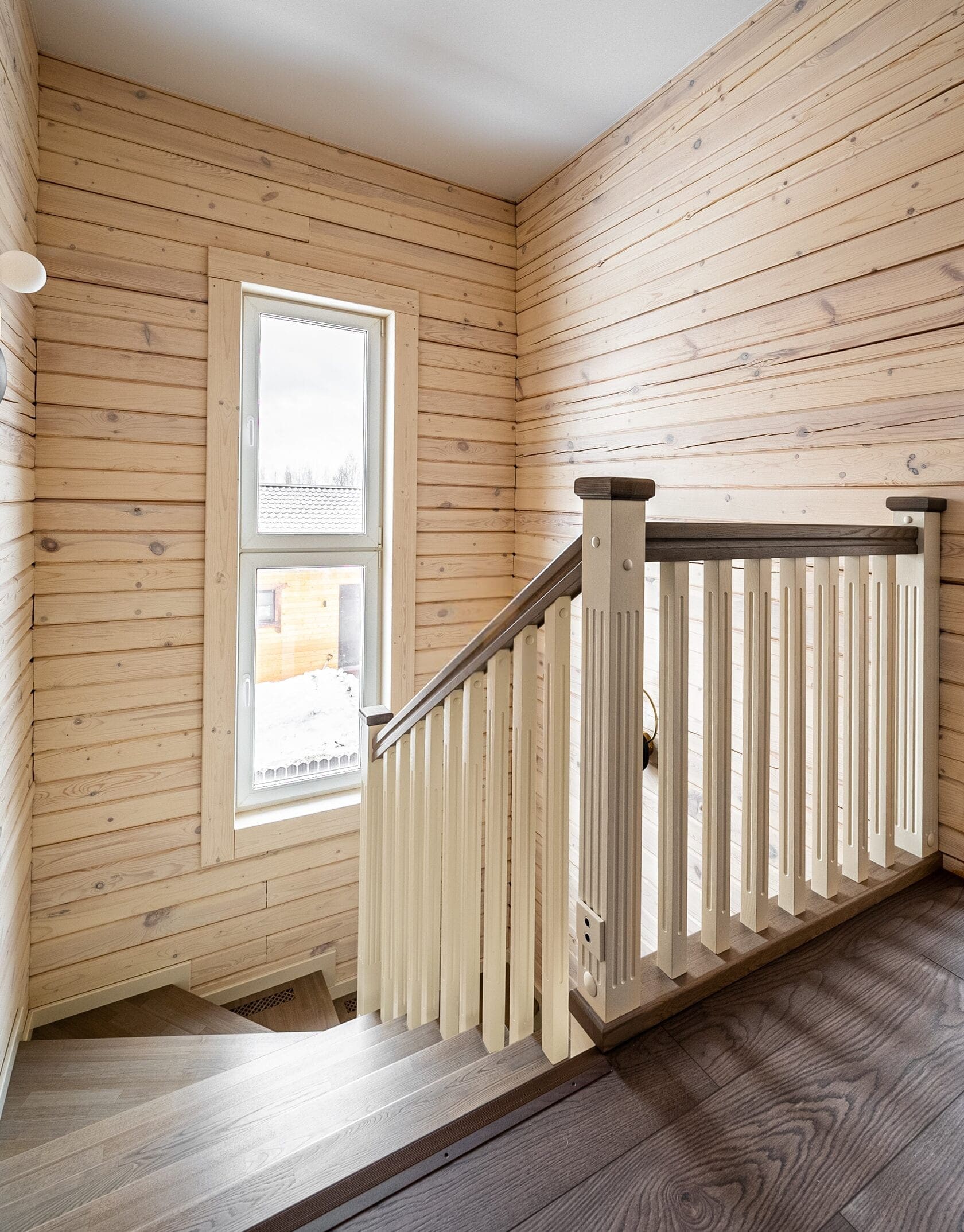 Подлестничное пространство и торцы рабочие заказчика обшили имитацией бруса в цвет стен