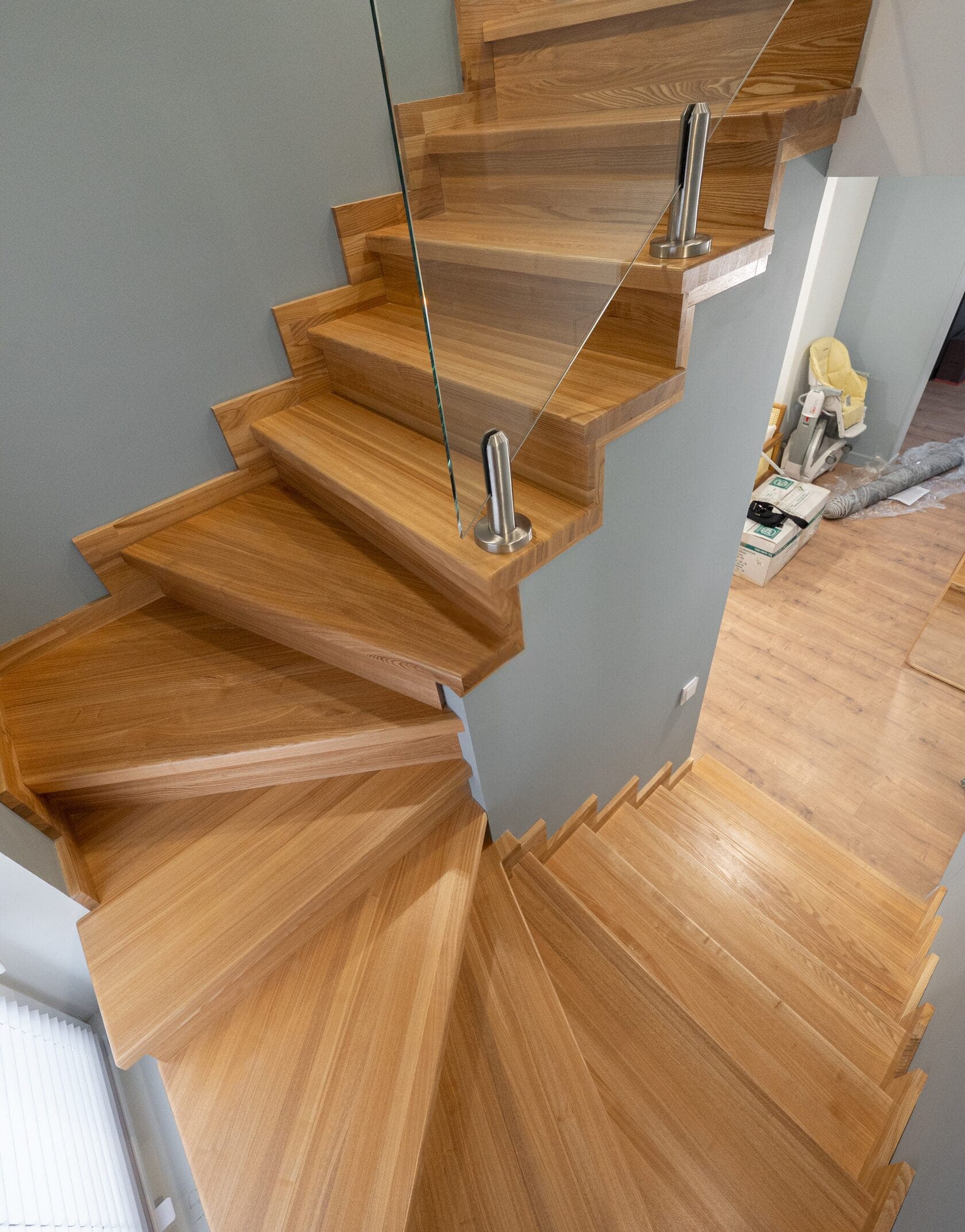 Отделка закрытого металлокаркаса трехмаршевой лестницы цельноламельным ясенем.