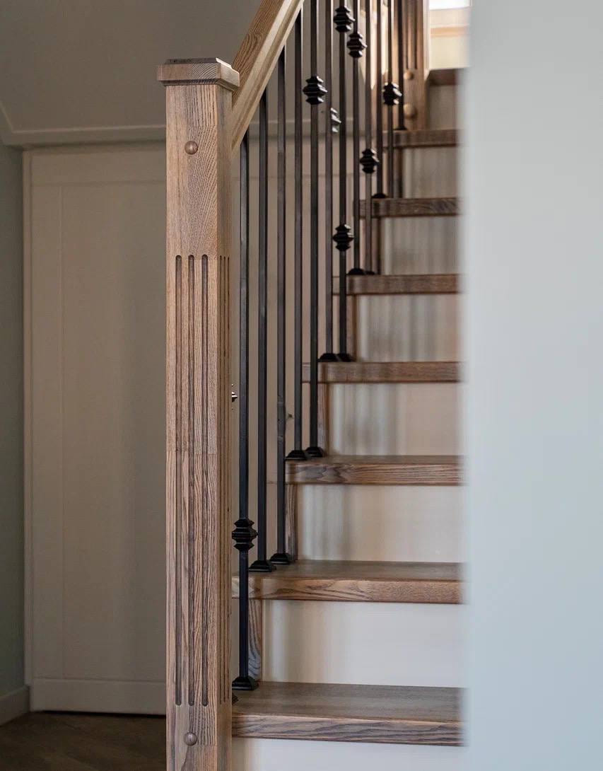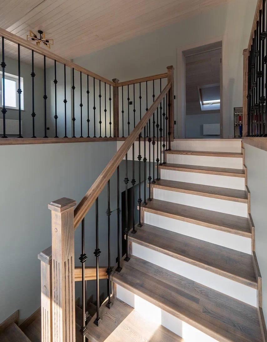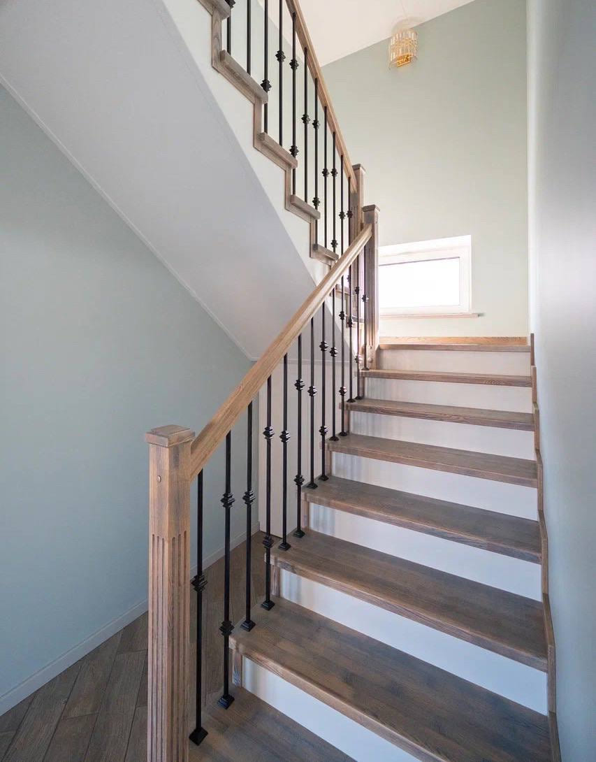 Ограждение с металлическими балясинами и деревянным поручнем.