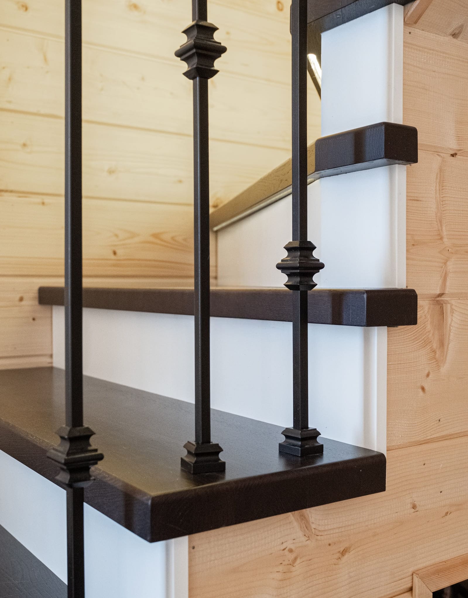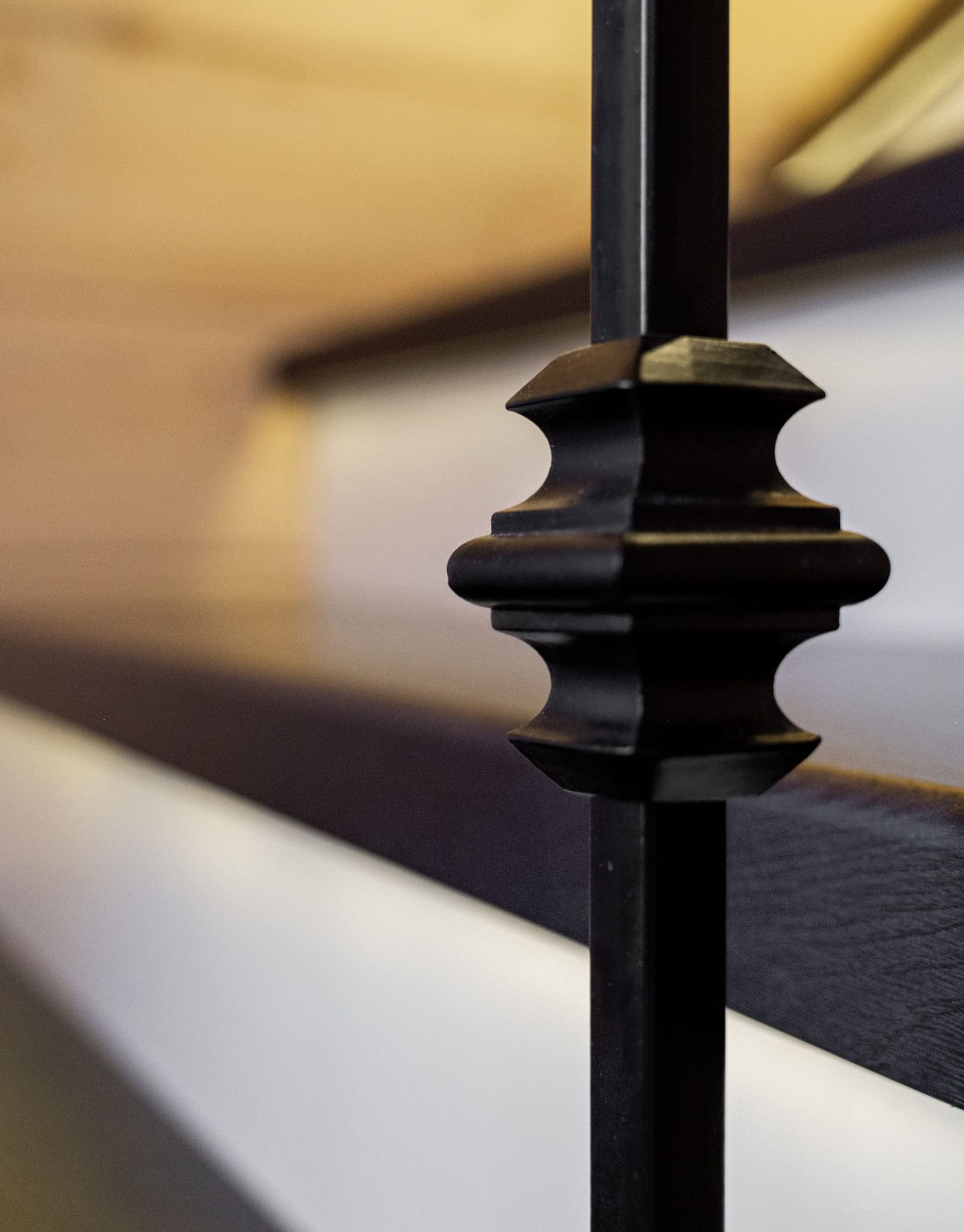 Огражедние с металлическими балясинами на лестнице, балюстраде и у окна.