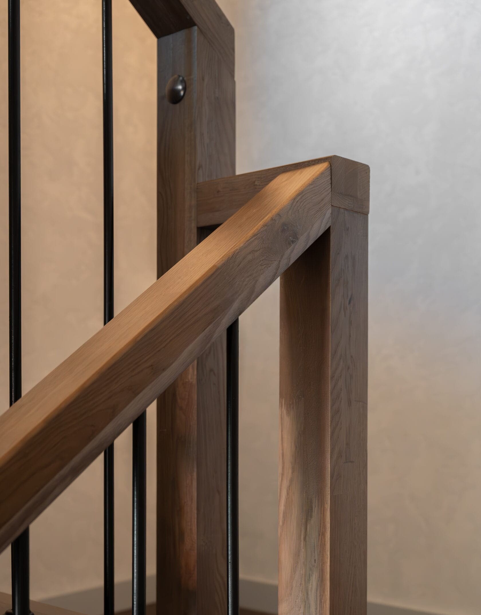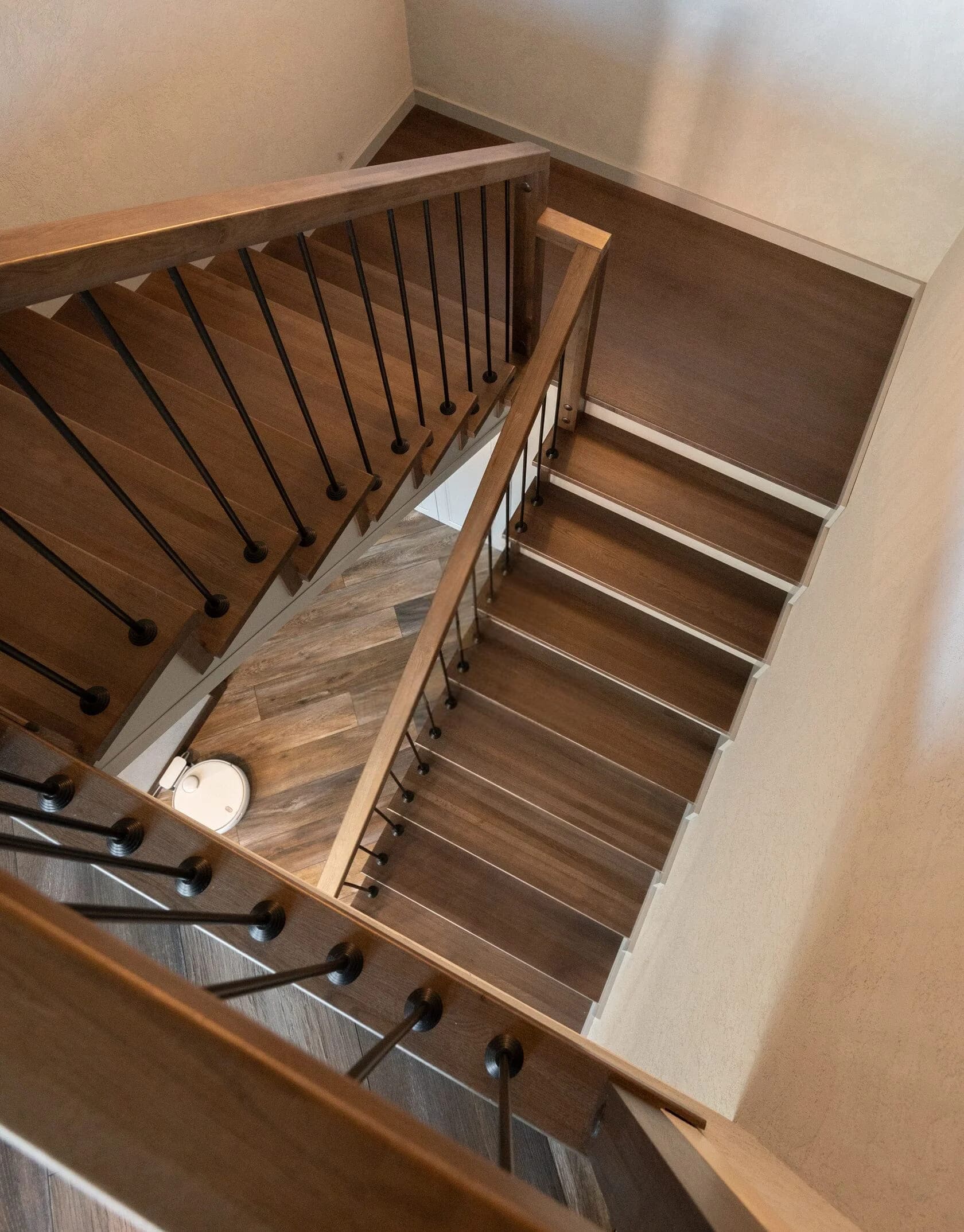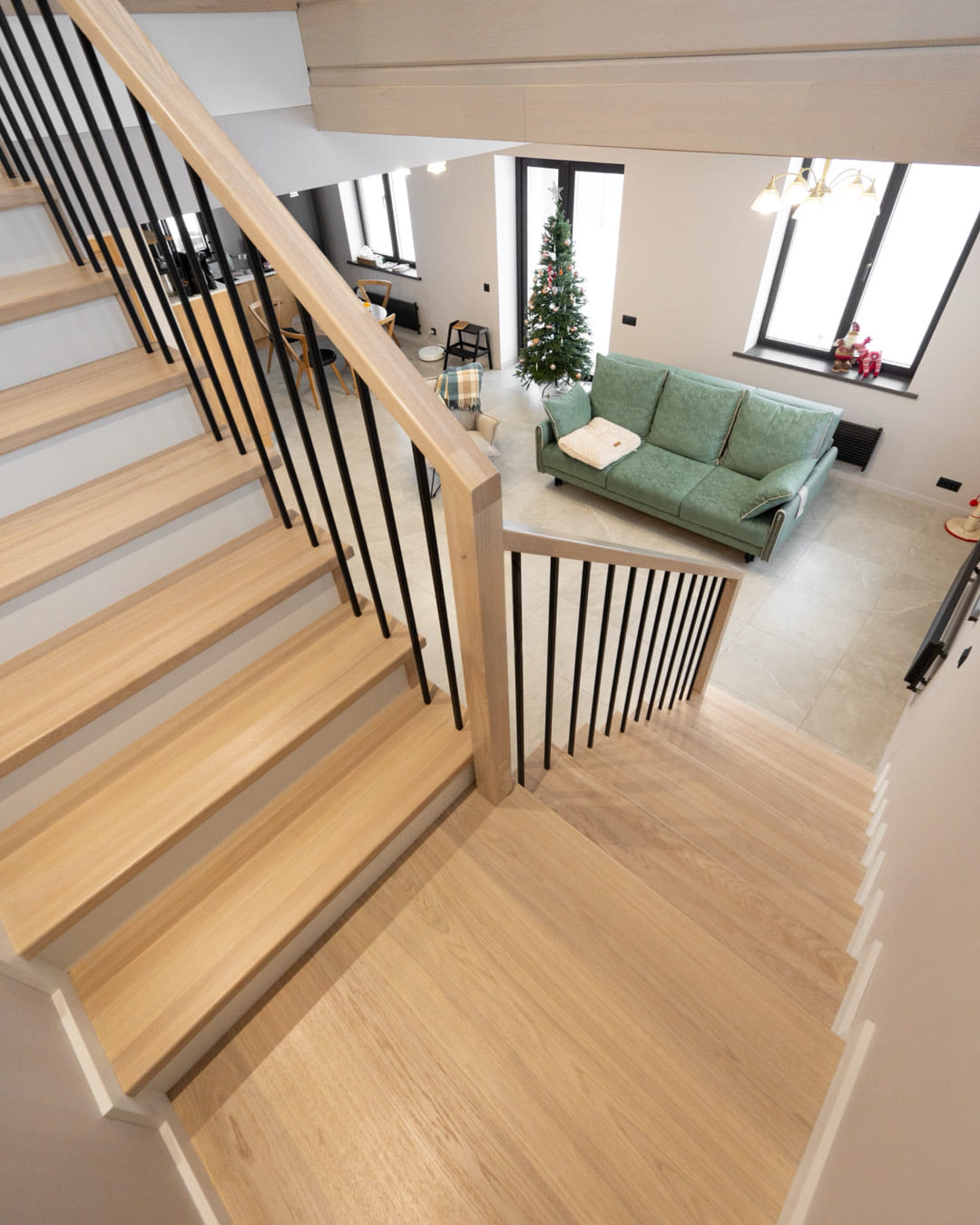 Лестница на металлокаркасе со ступенями из цельноламельного дуба.