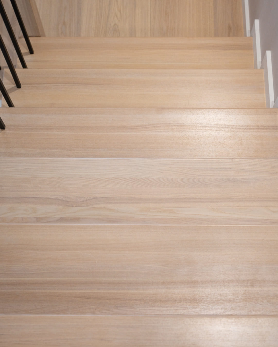 На ступенях сращенный ясень, подступенки из МДФ, плинтус шпонированный.