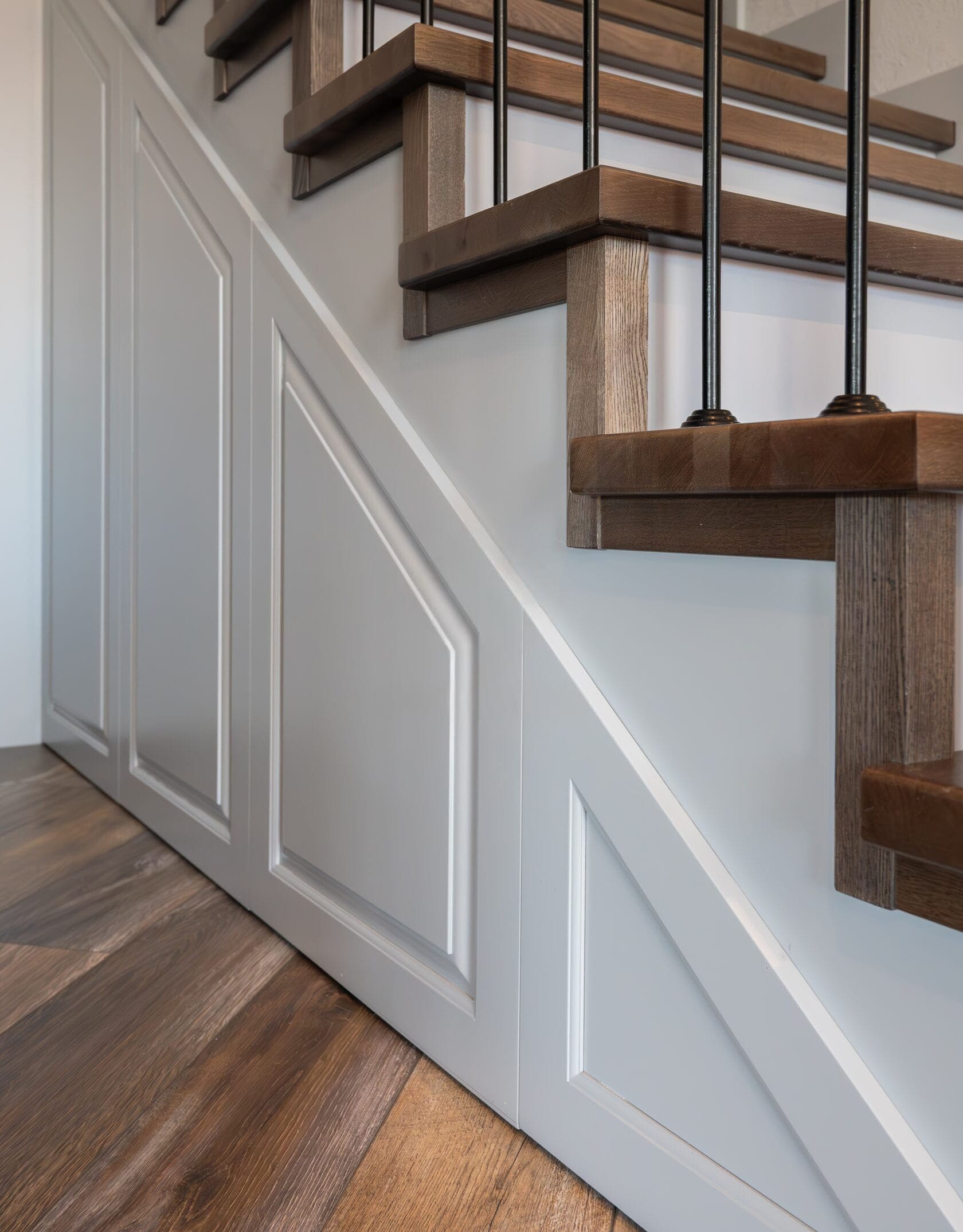 Под лестницей сделали кладовку с жалюзийными дверками под площадкой и первым маршем