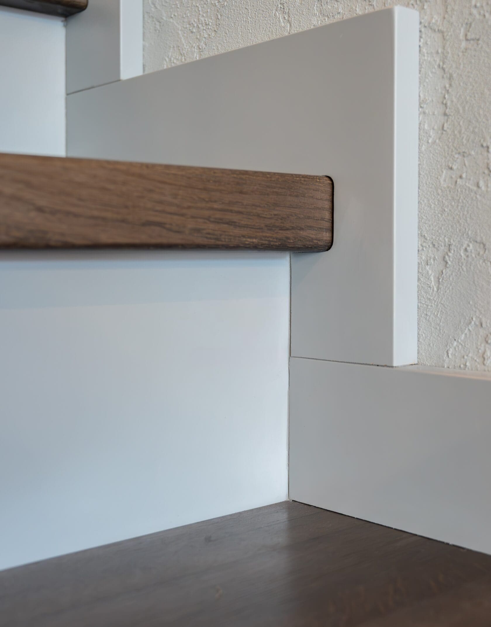 Ступени из цельноламельного дуба, подступенки и плинтус из МДФ.