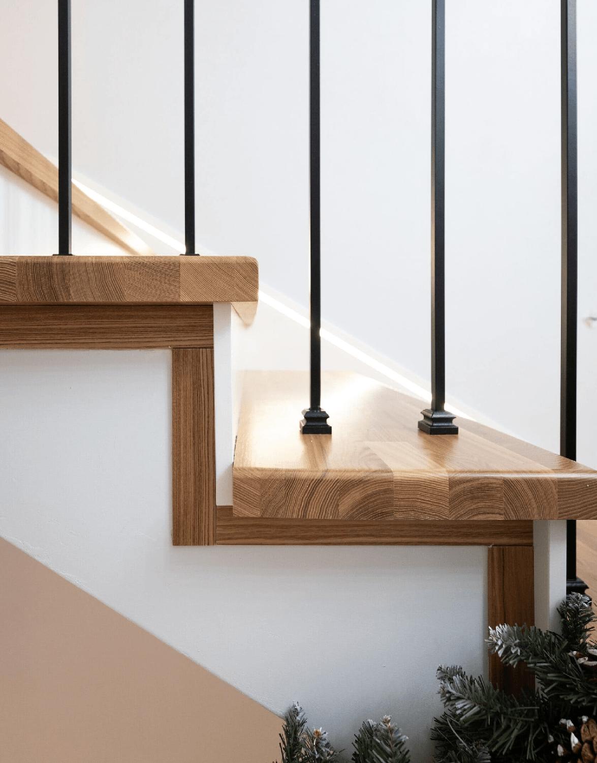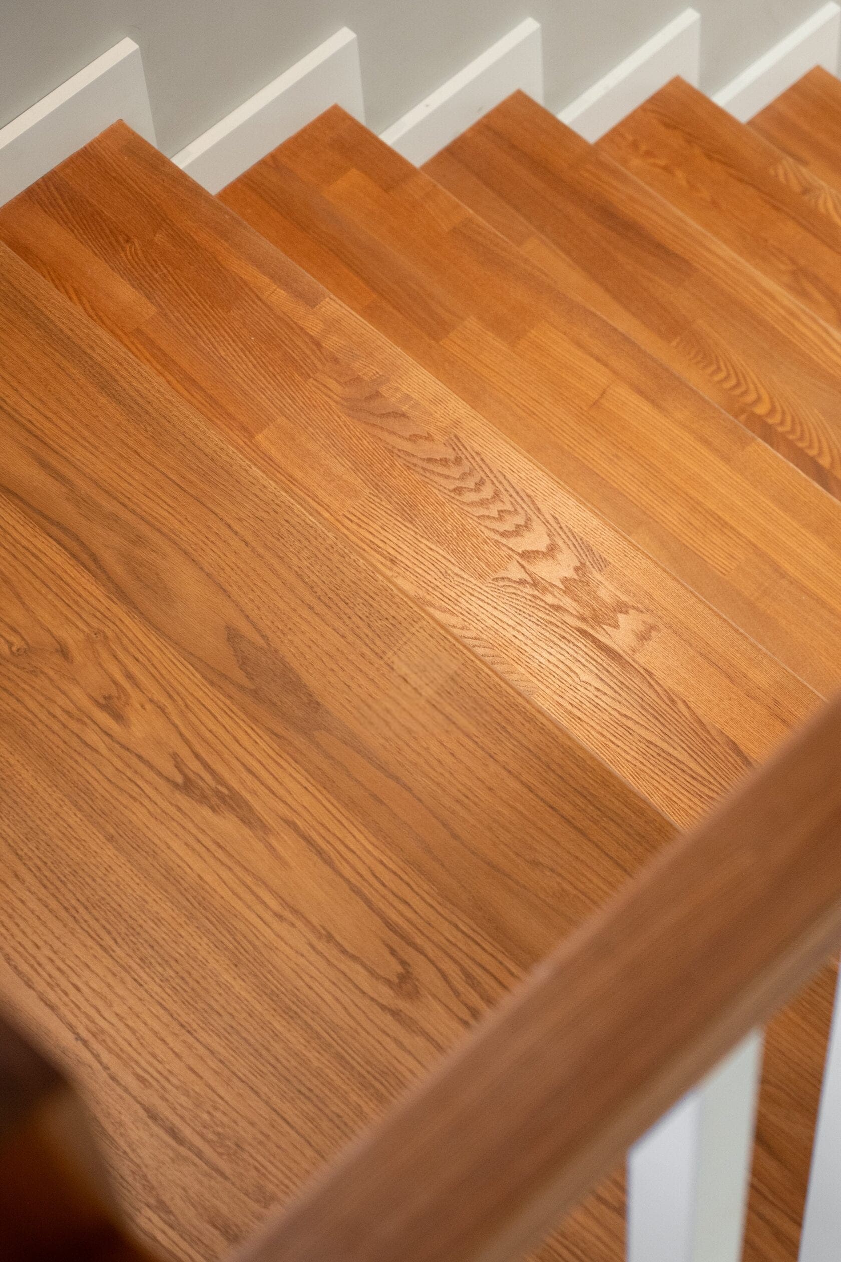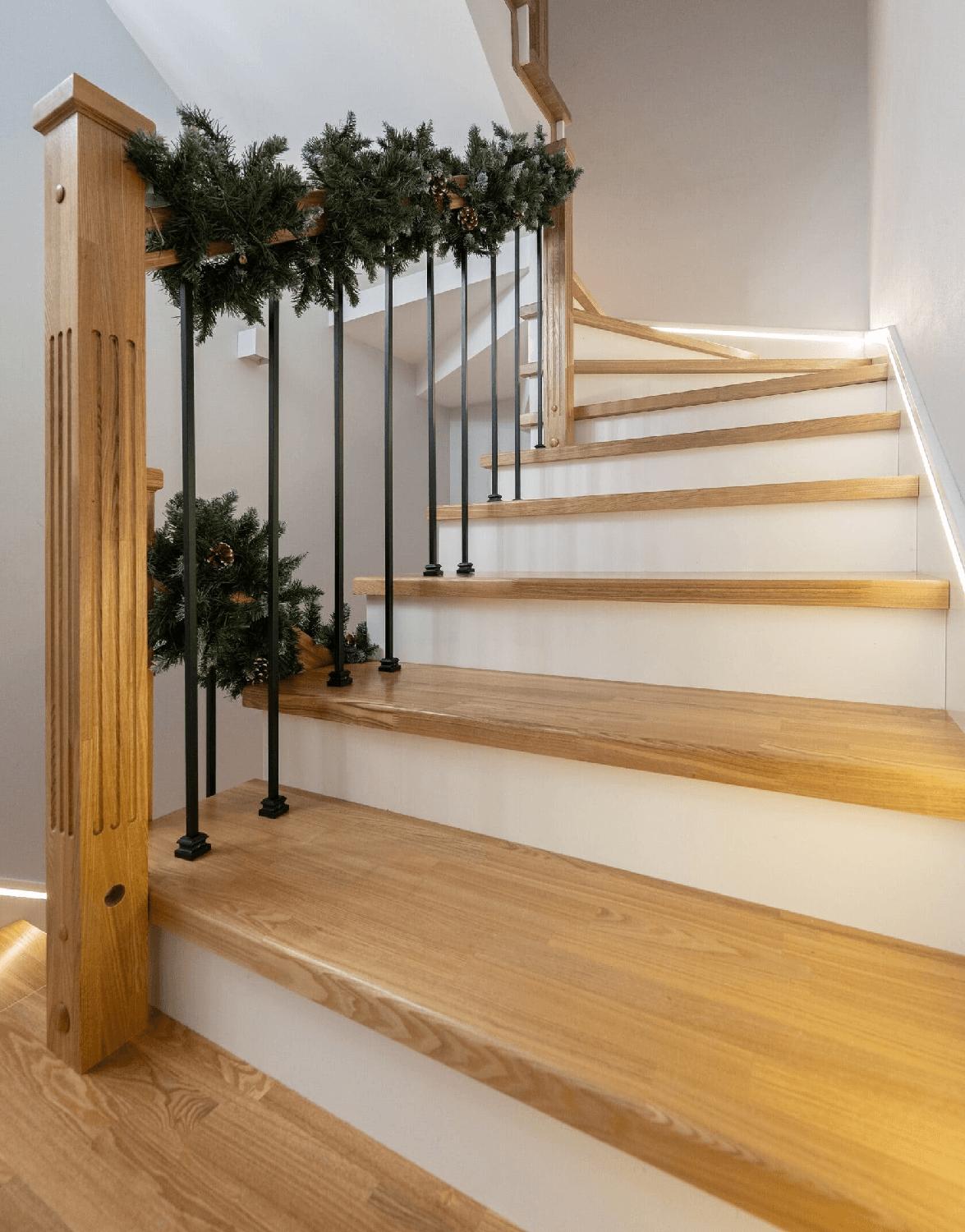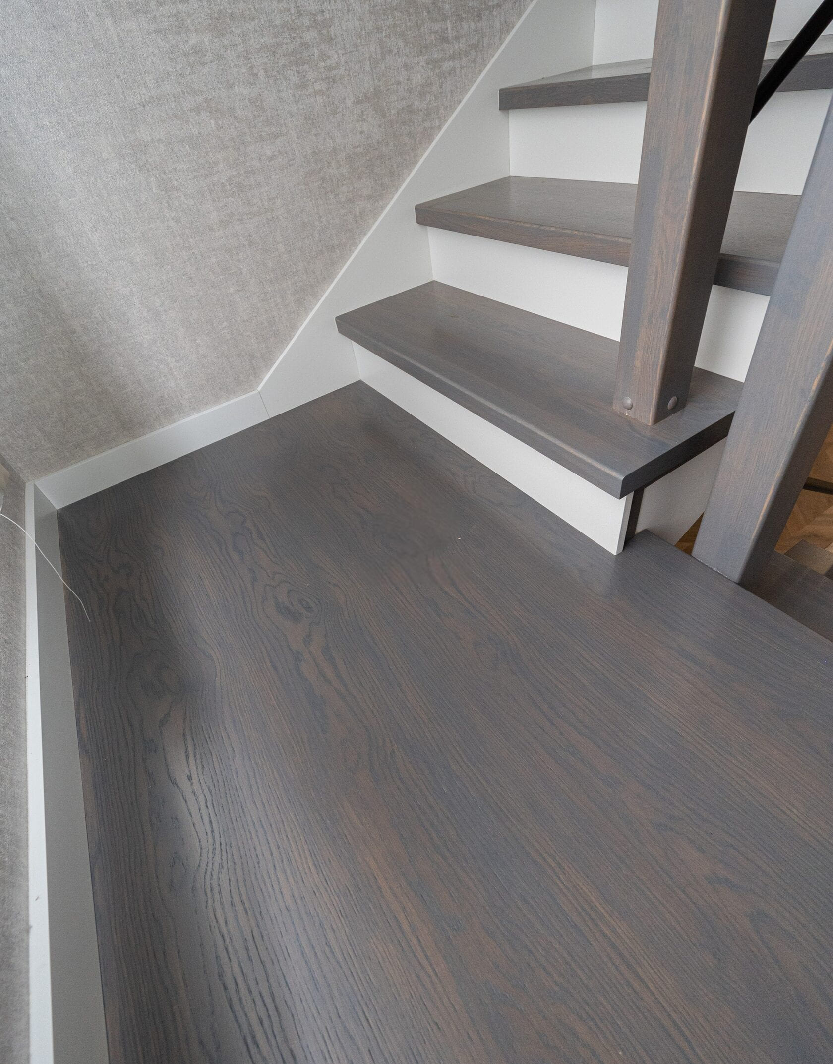 Облицовка бетонной лестницы цельноламельным дубом, подступенки и плинтус из МДФ под белой эмалью.