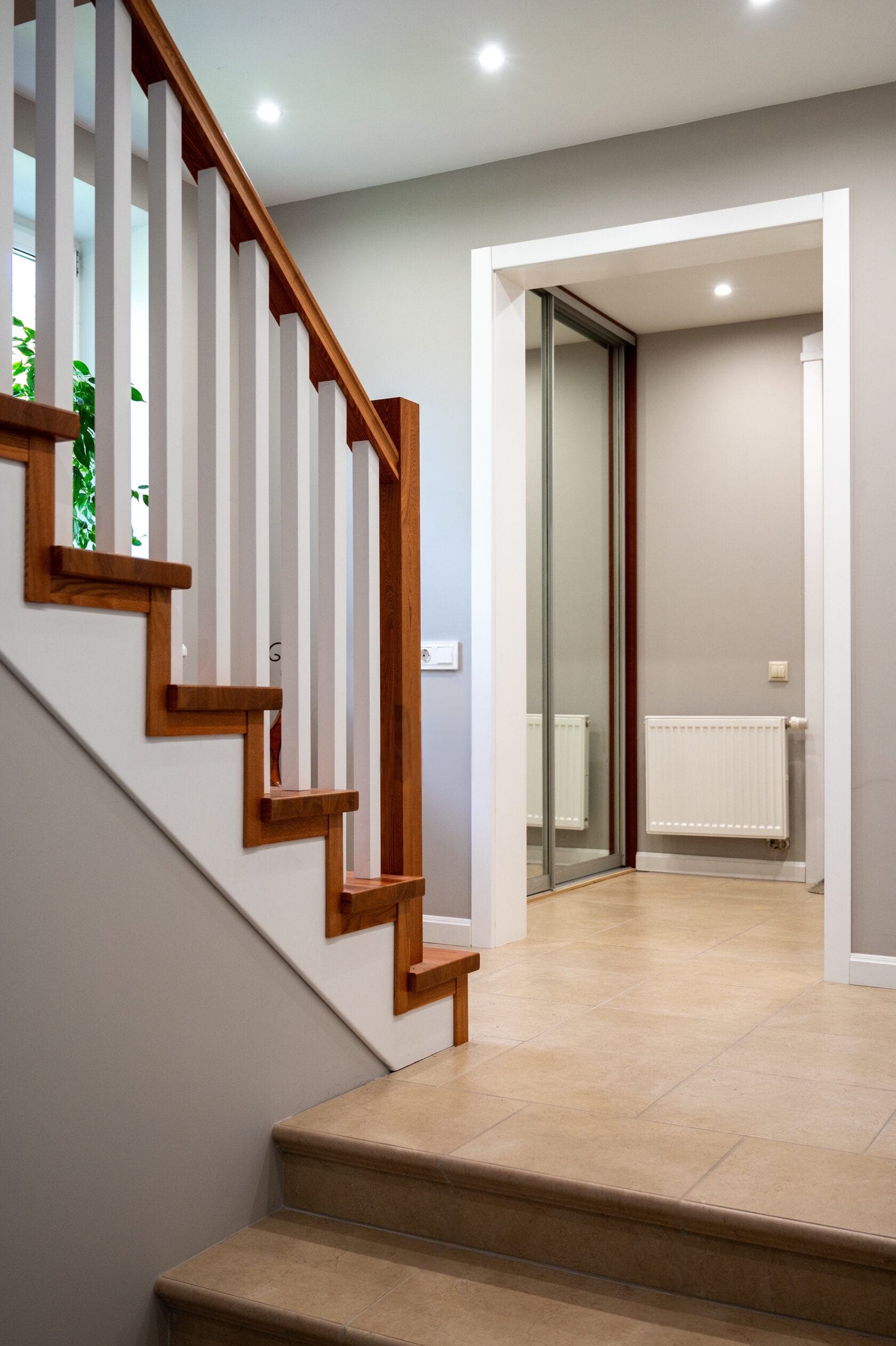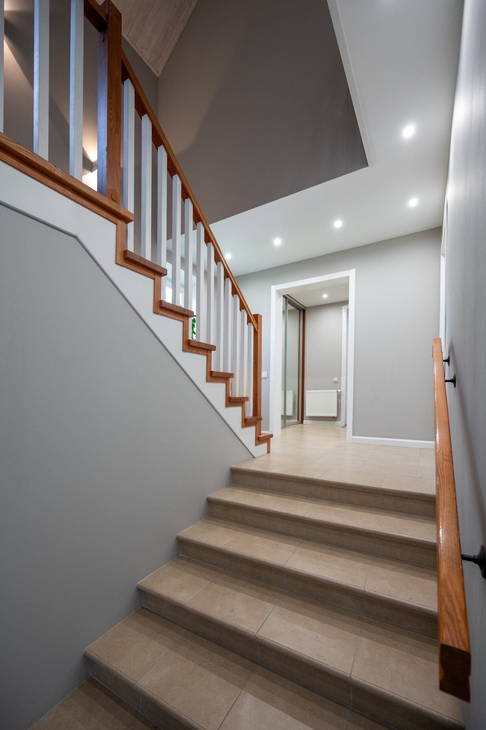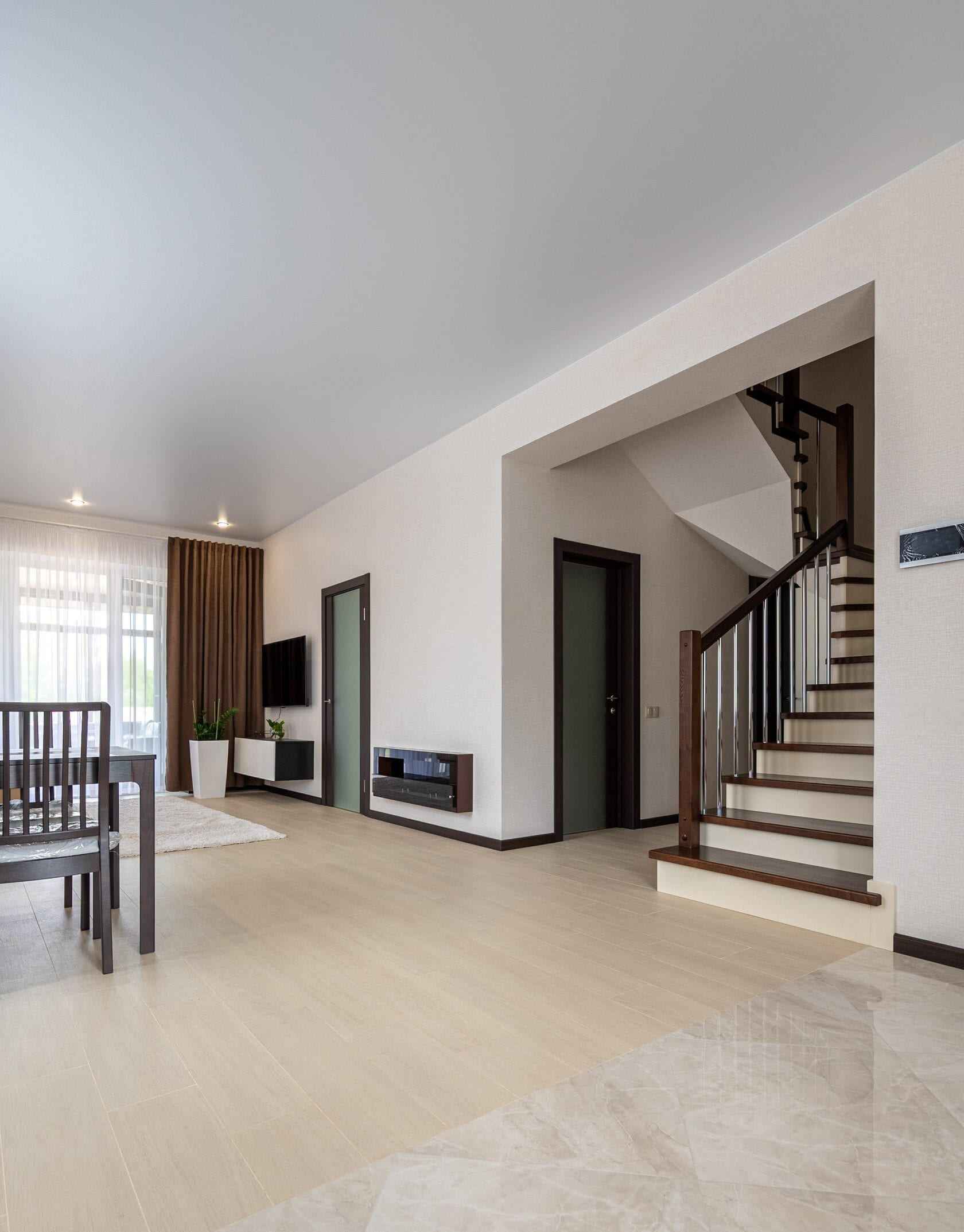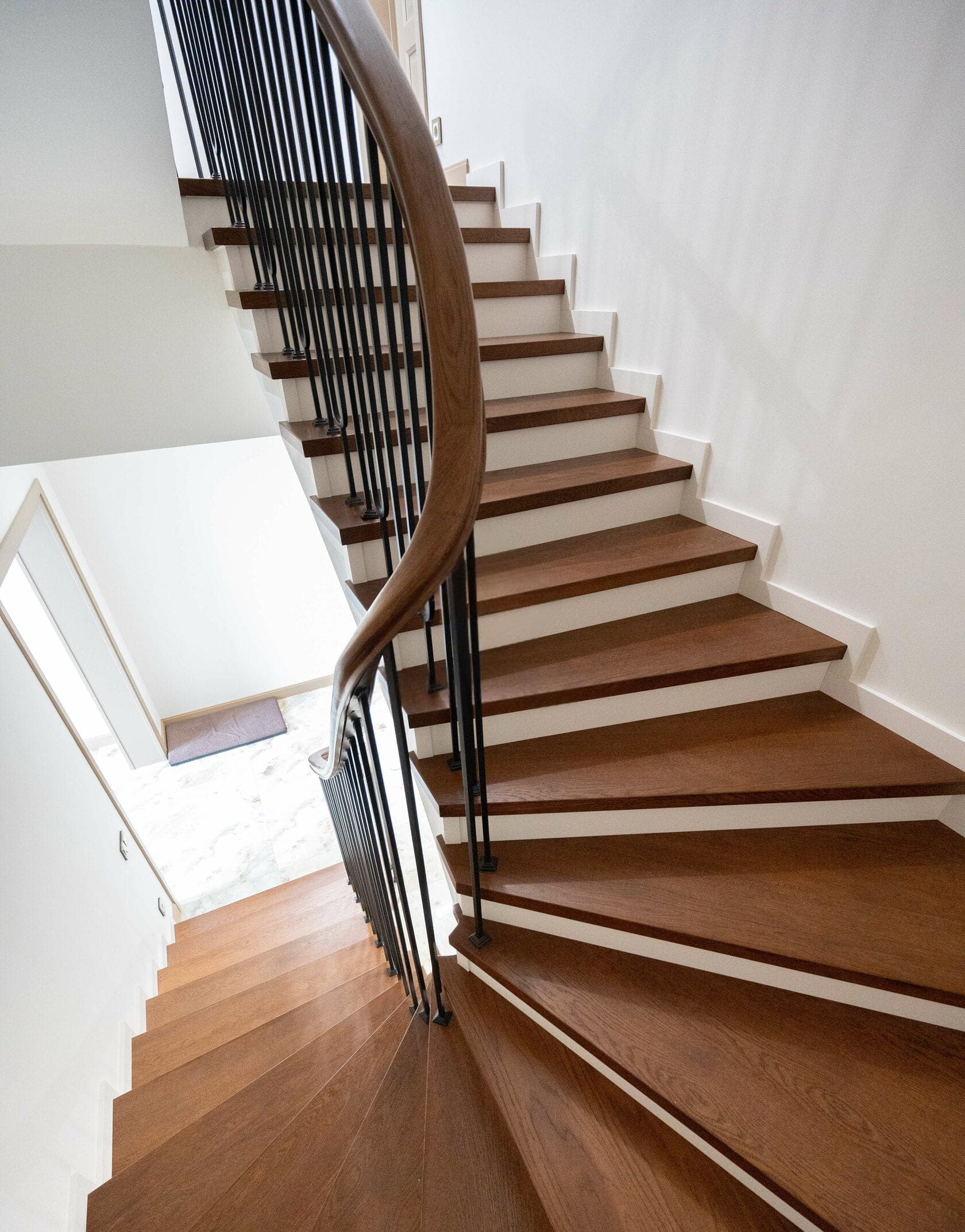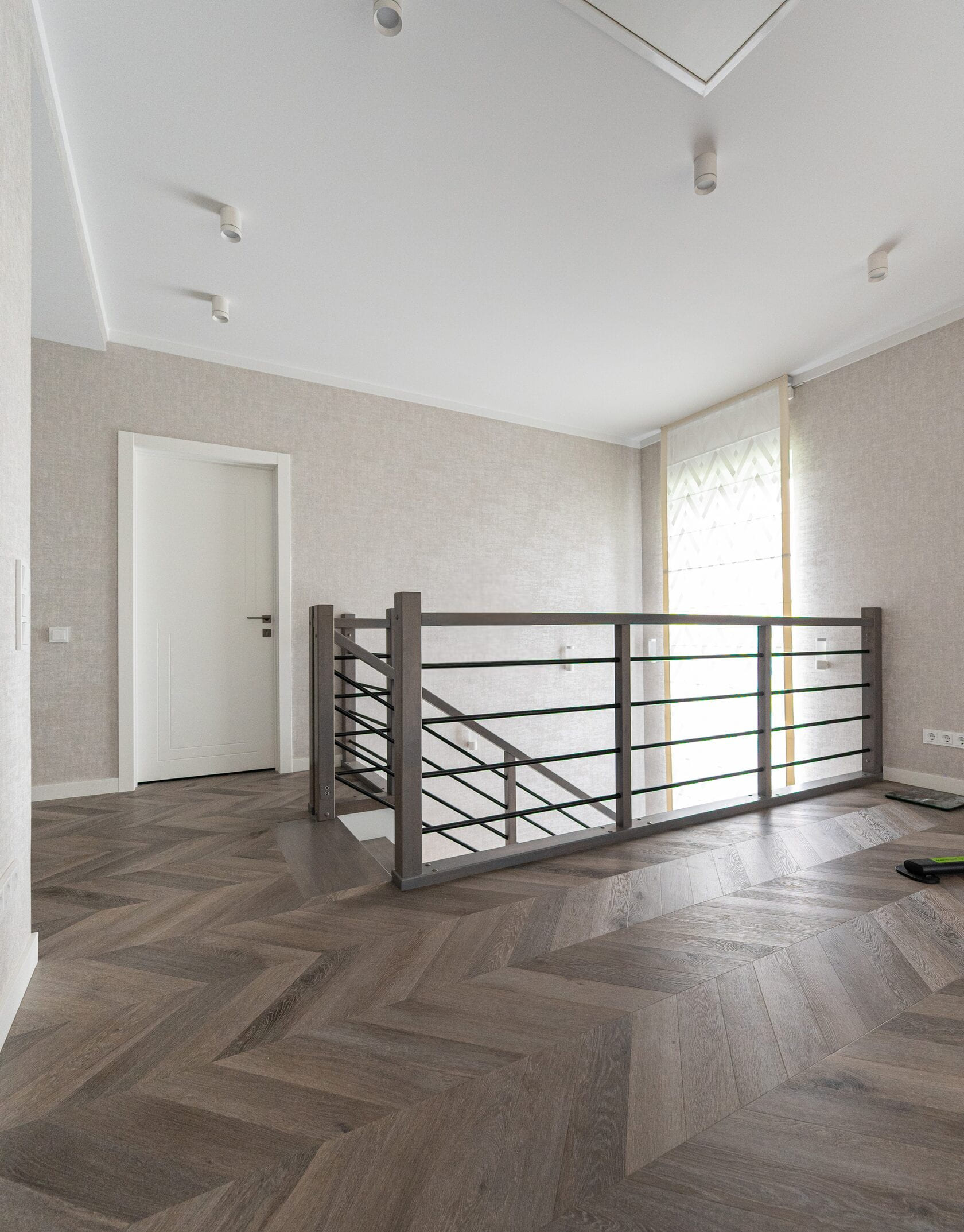 Облицовка бетонной лестницы цельноламельным дубом, подступенки и плинтус из МДФ под белой эмалью.