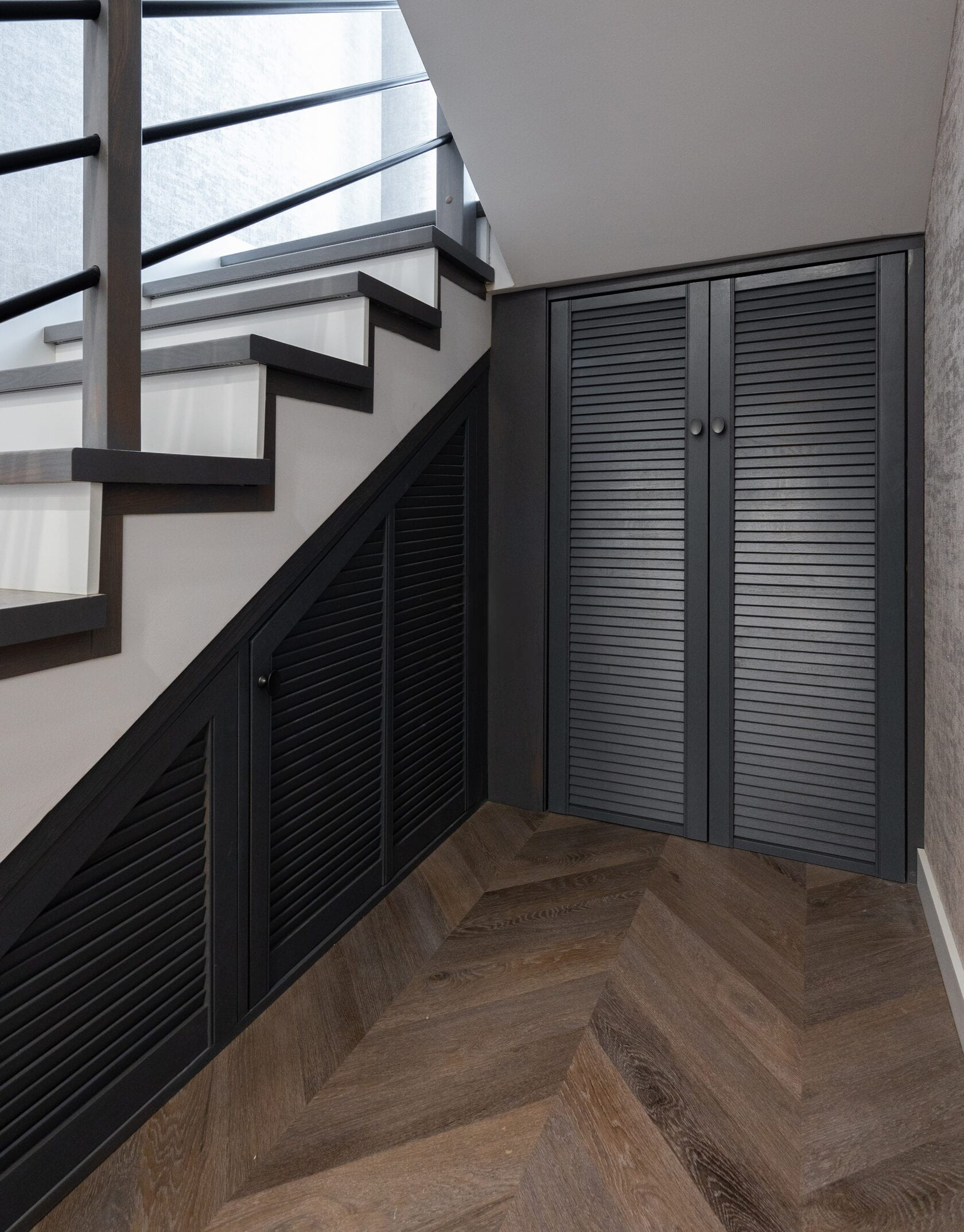 Под лестницей сделали кладовку с жалюзийными дверками.