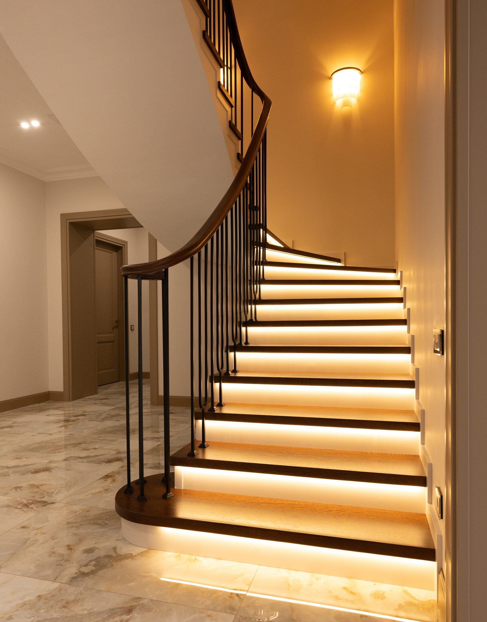 Ограждение с балясинами «камертонами» и гнутым неразрывным поручнем по всей лестнице.