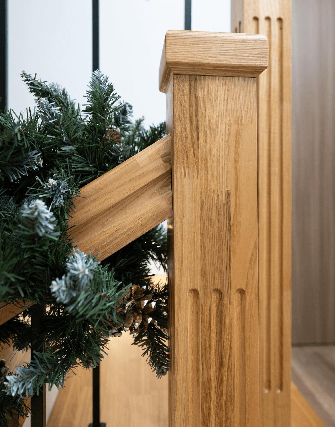 Отделка Г-образного металлокаркаса лестницы сращенным ясенем натурального цвета.